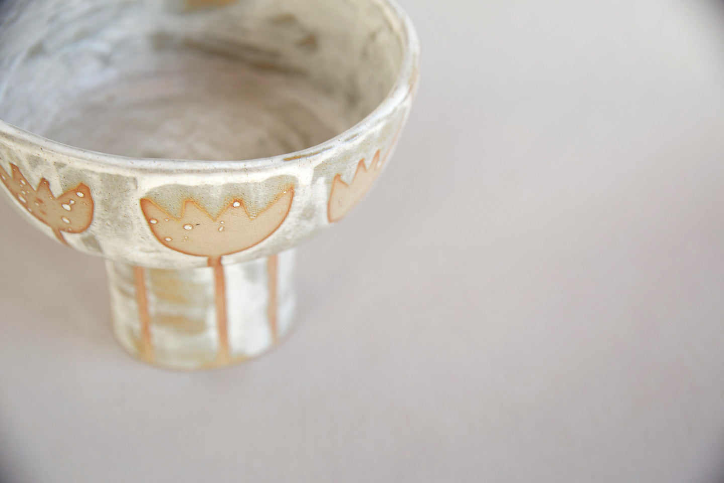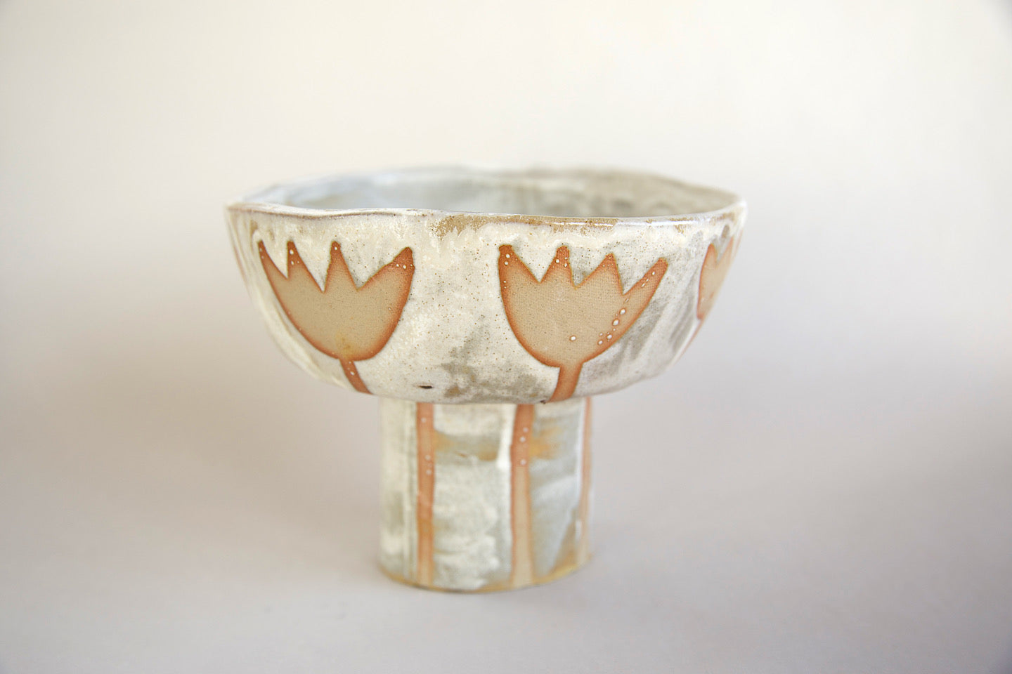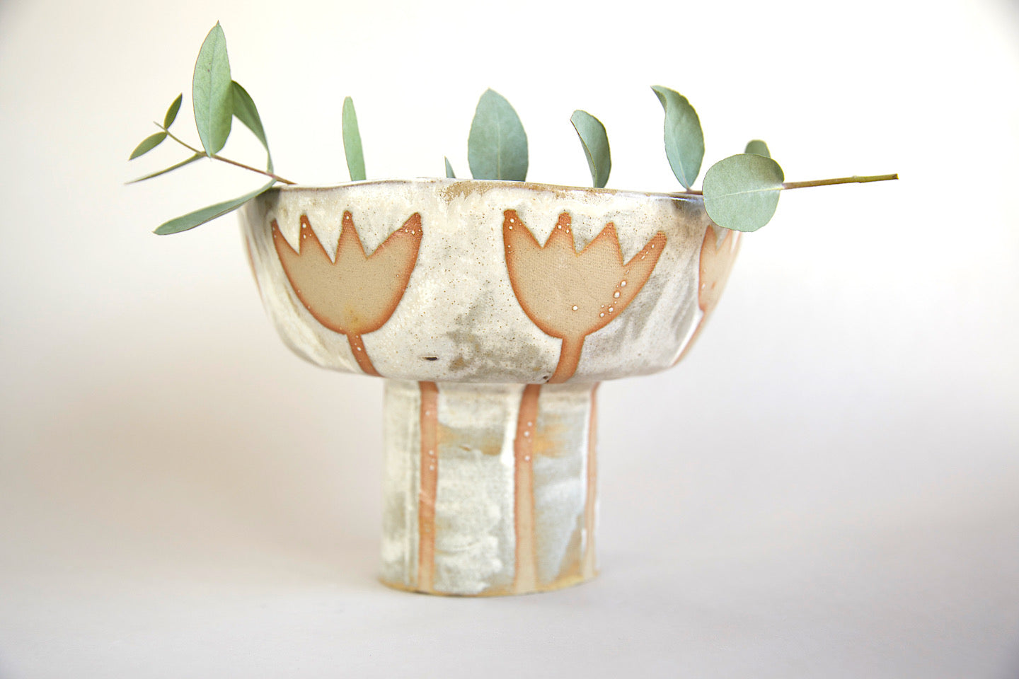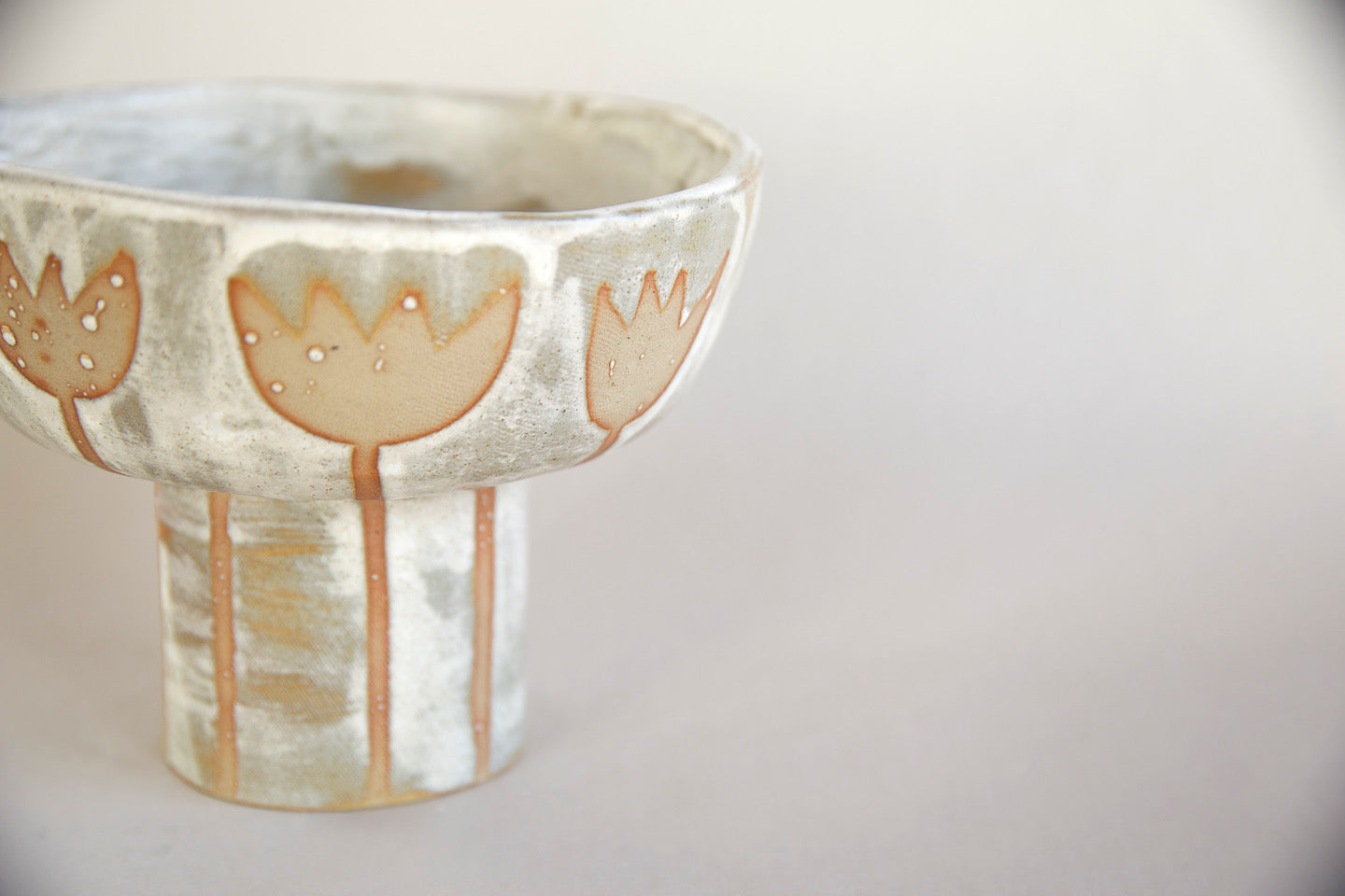 Alzata in terra Grés e smalto bianco apiombico. Decorata a mano.