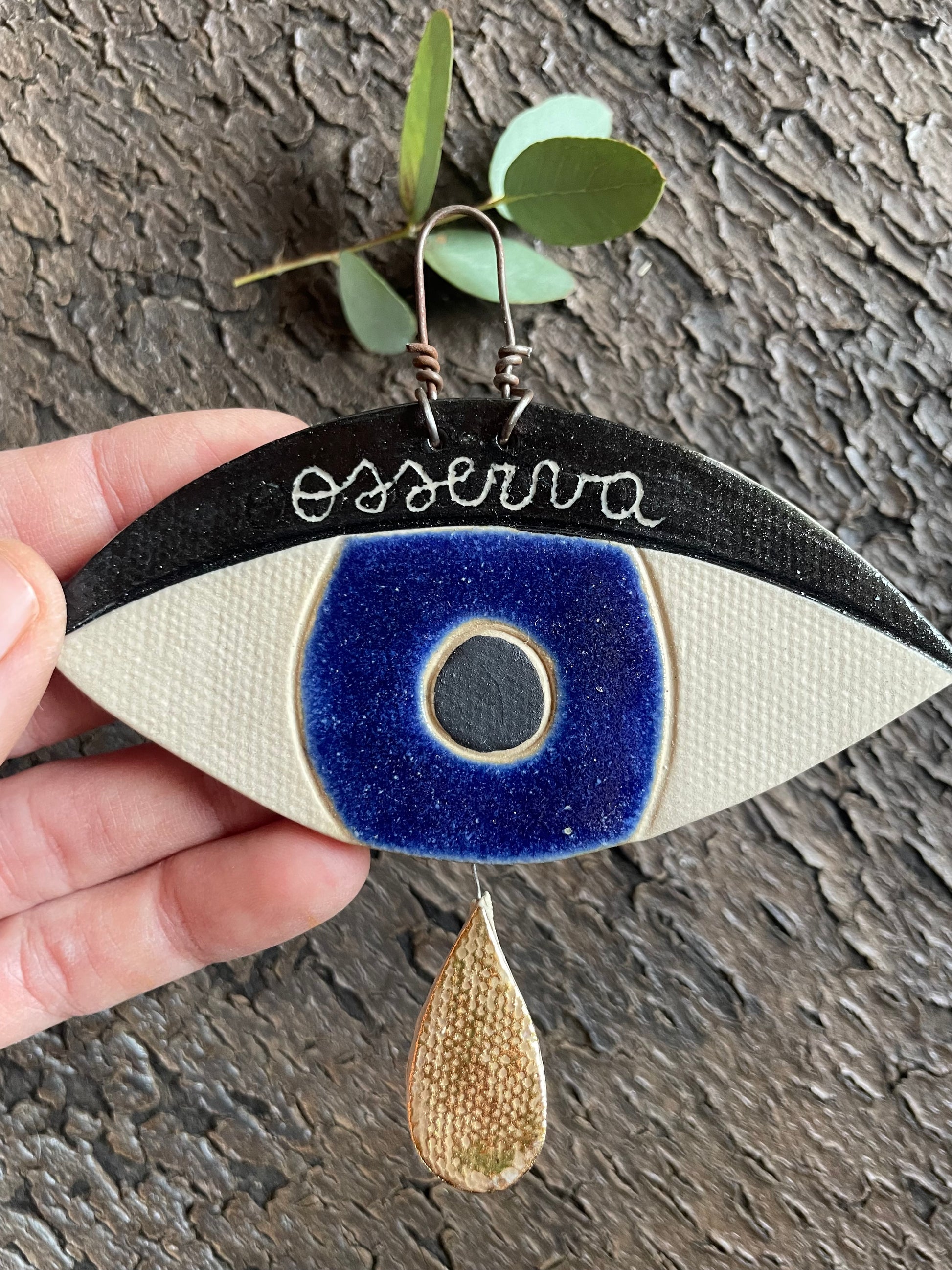 Questo Occhio amuleto verde è un pezzo unico in gres dipinto a mano e poi rifinito con lustro oro. Aggiungi bellezza e fortuna alla tua vita con questo amuleto che ti osserva sempre e ti protegge dai mali. Un'aggiunta unica alla tua collezione di decorazioni per la casa.