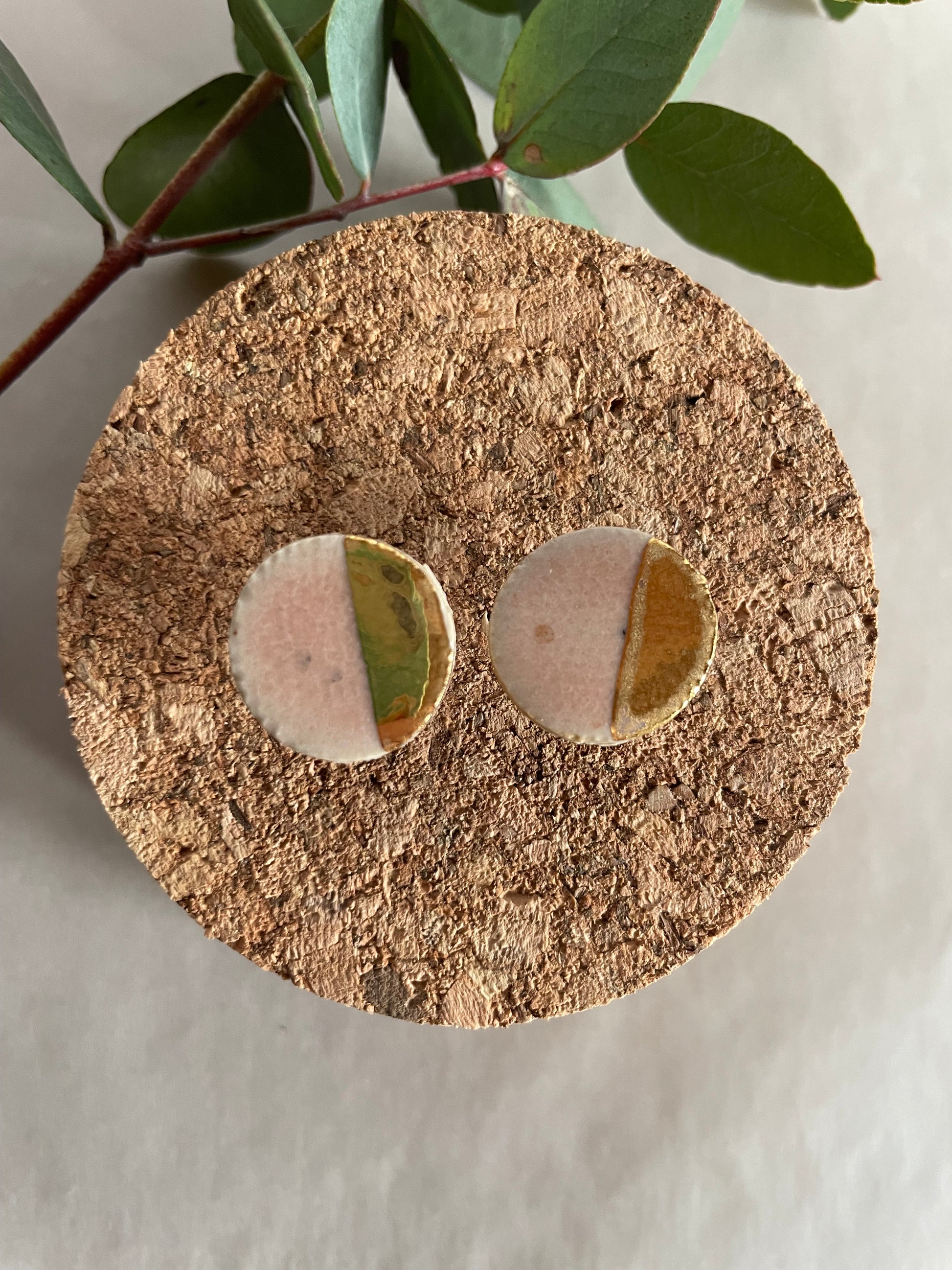 Questi orecchini sono perfetti per chi vuole indossare un gioiello comodo che aggiunge un tocco di luce al proprio look. Sono fatti in gres lavorato a lastra e poi intagliato a mano libera; la finitura è bloccata per mezzo di smalto colore rosa lievemente puntinato, la lavorazione è impreziosita dai decori oro 18K.