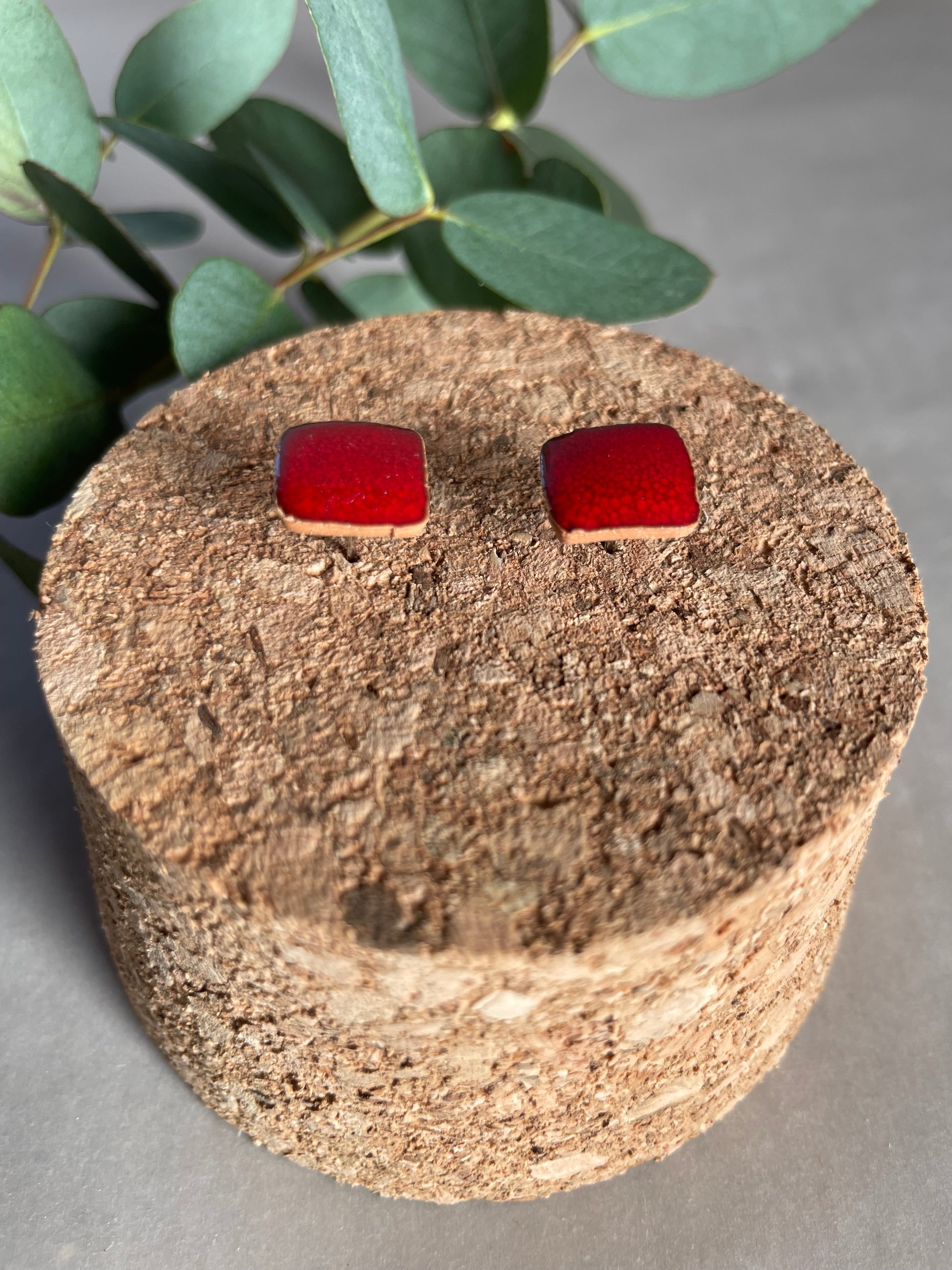 Materiale: terracotta , smalto rosso, supporto a perno in acciaio chirurgico anallergico. Misure: lato quadrato circa 0,8 cm.