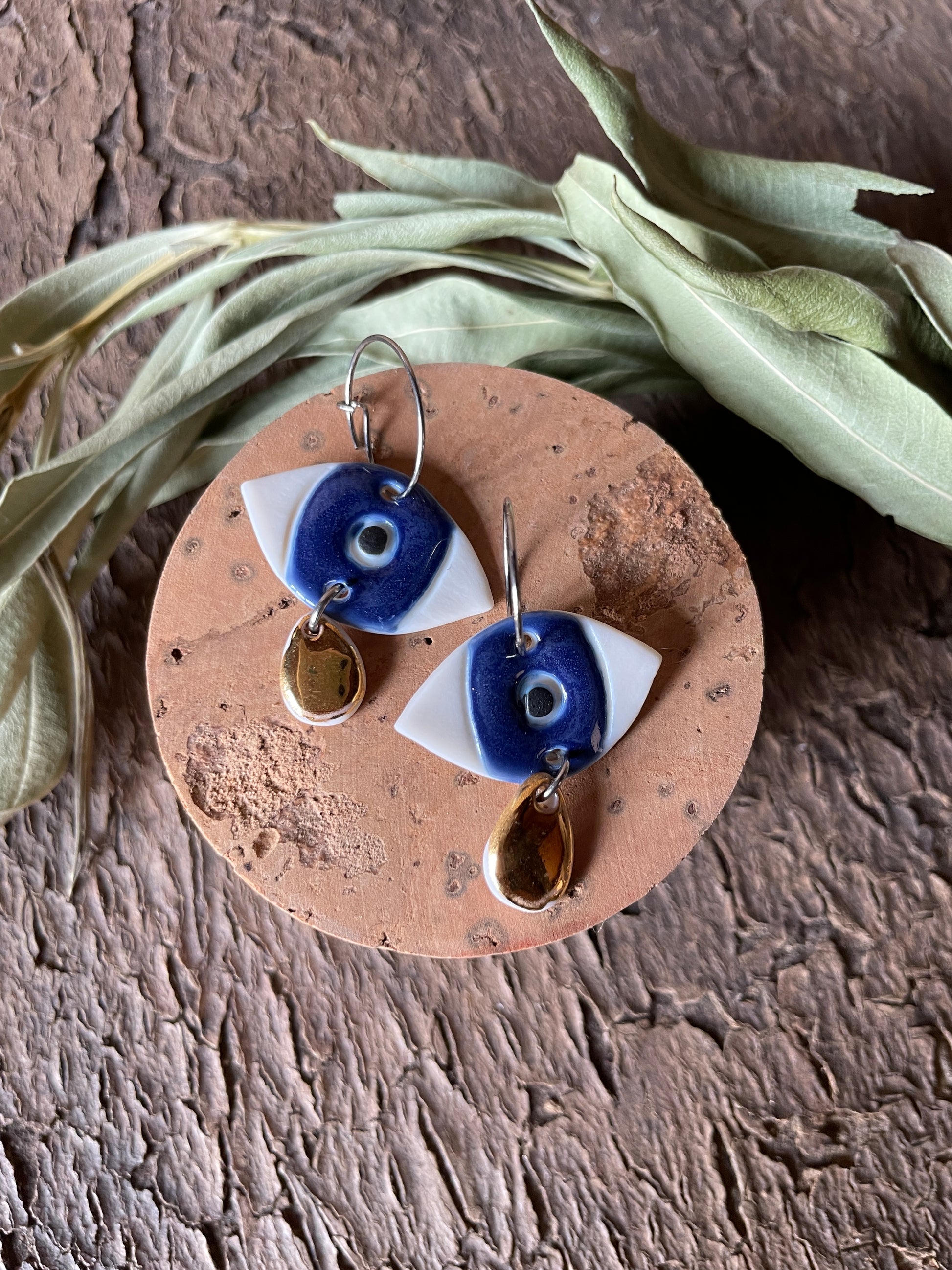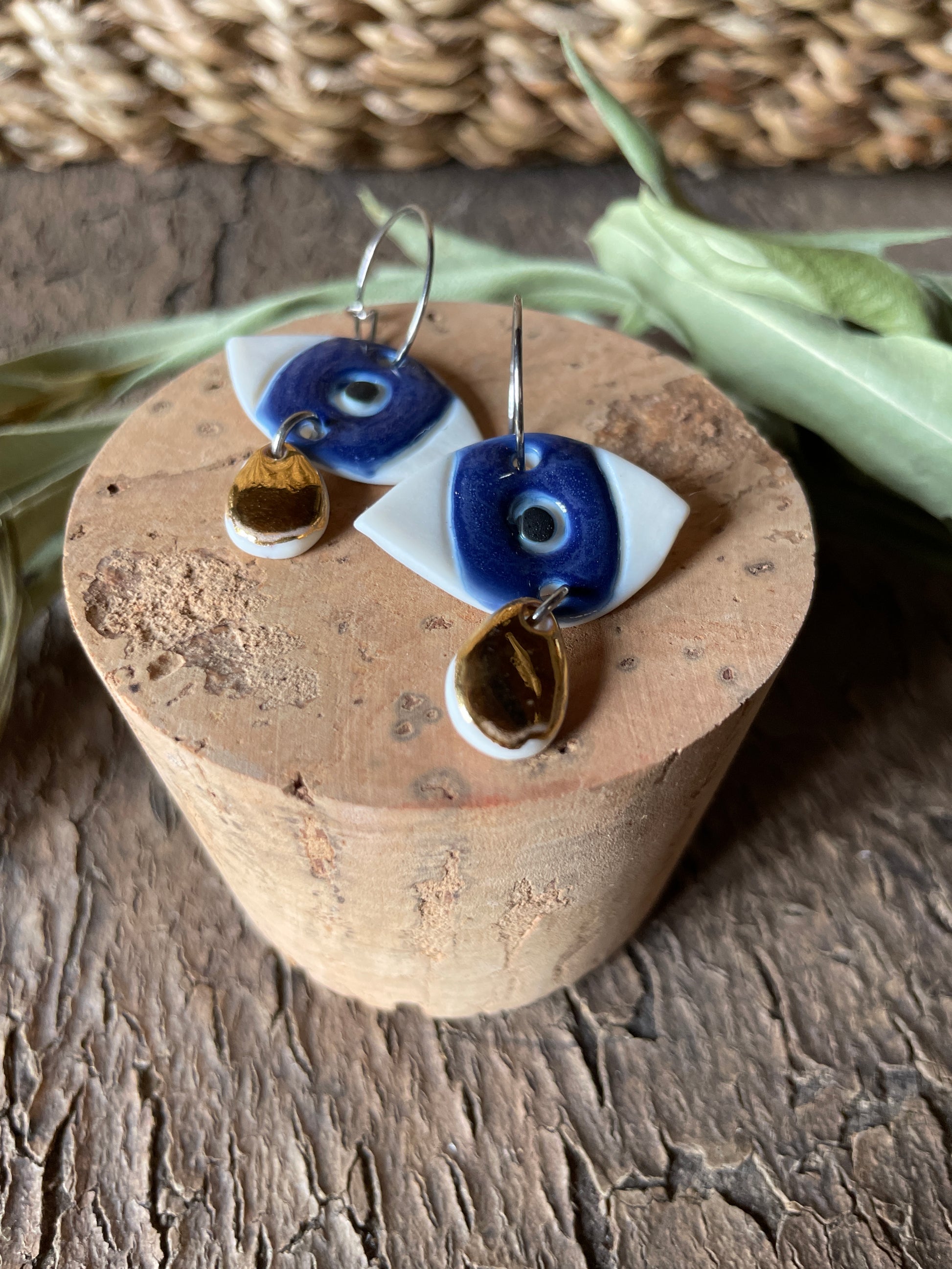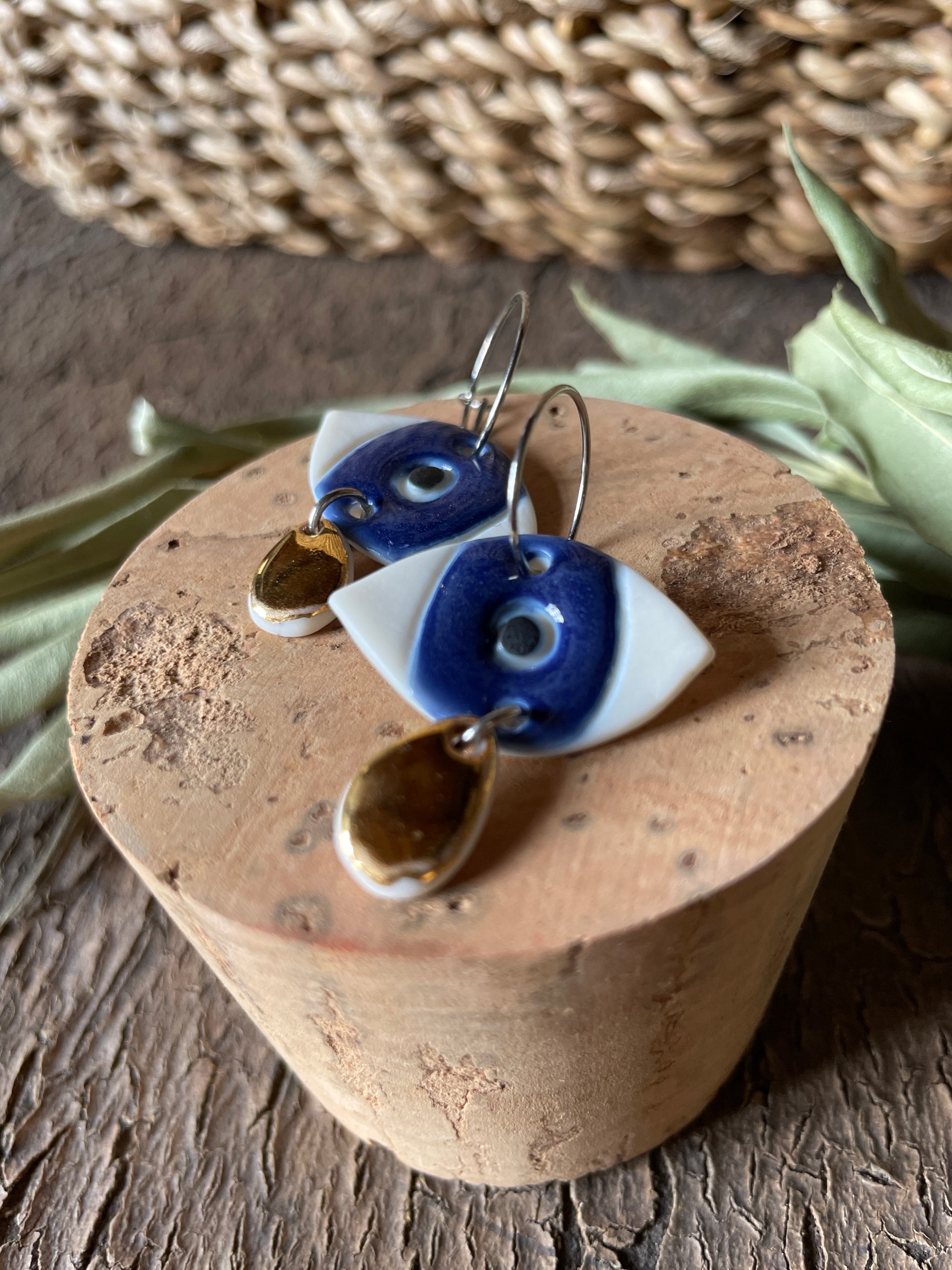 Questi pendenti occhio montati su cerchietto in acciaio anallergico, sono realizzati in fine Porcellana di Limoges decorata con smalti, cristallina e infine impreziositi con decoro oro 18K.