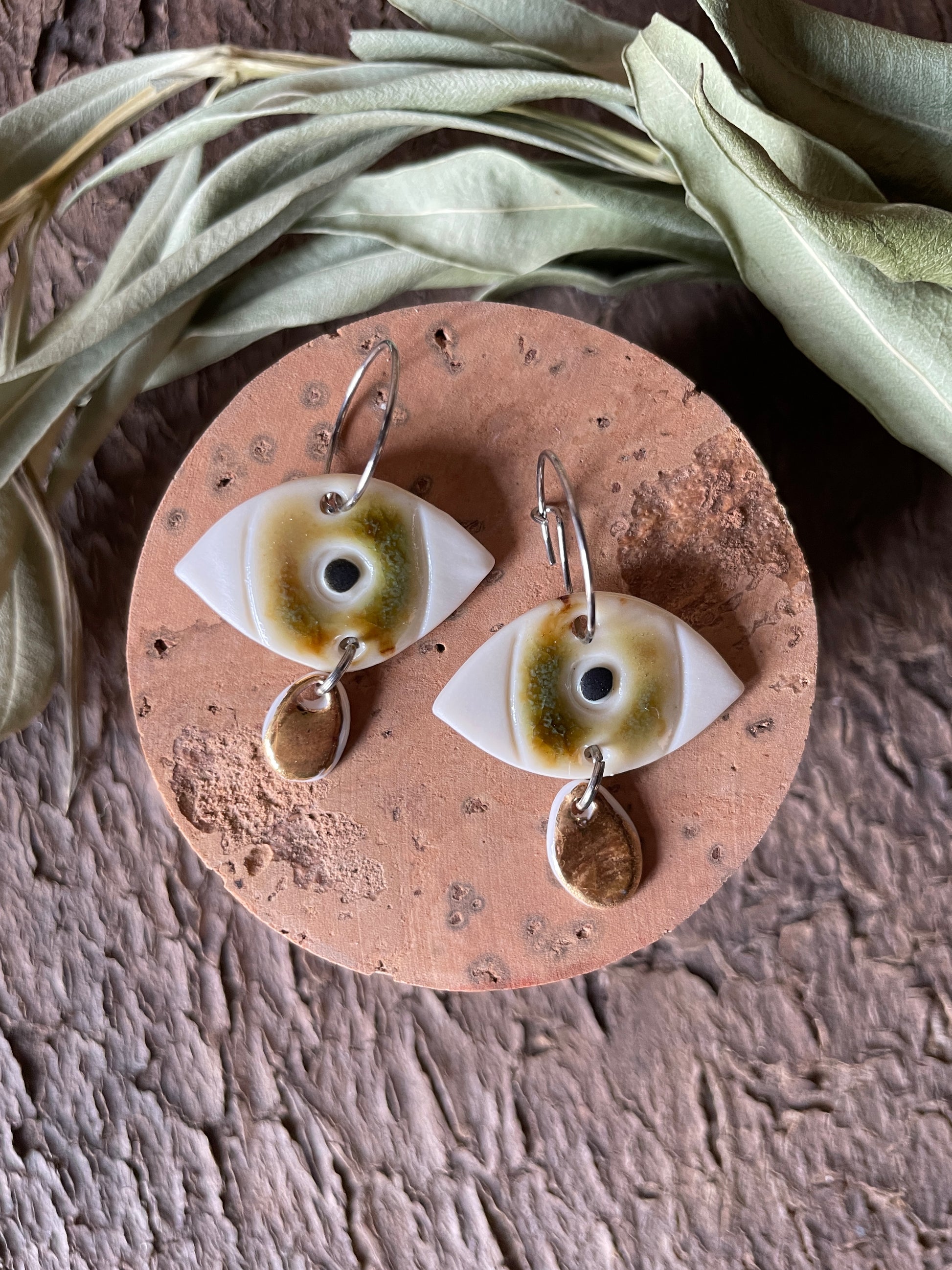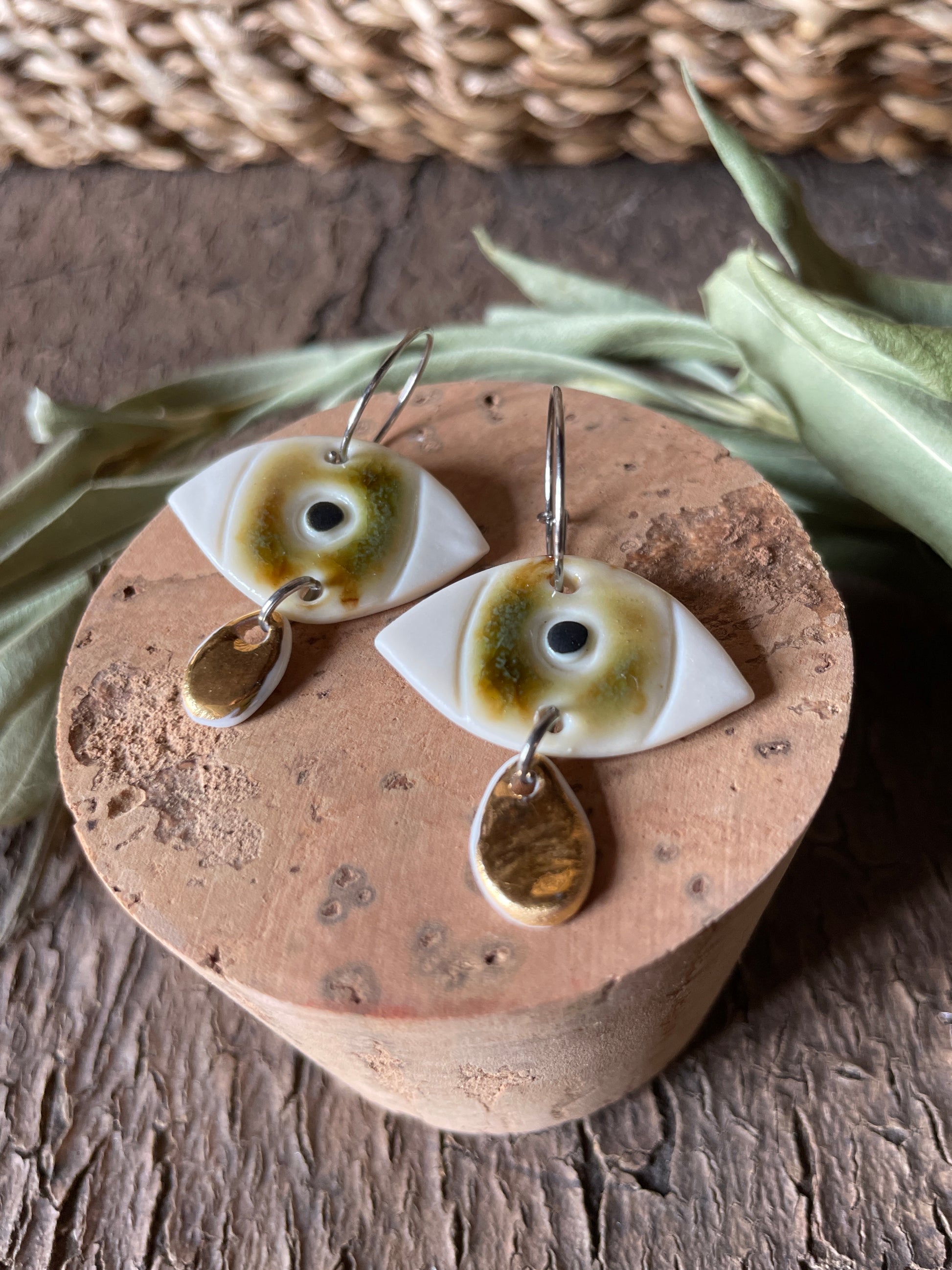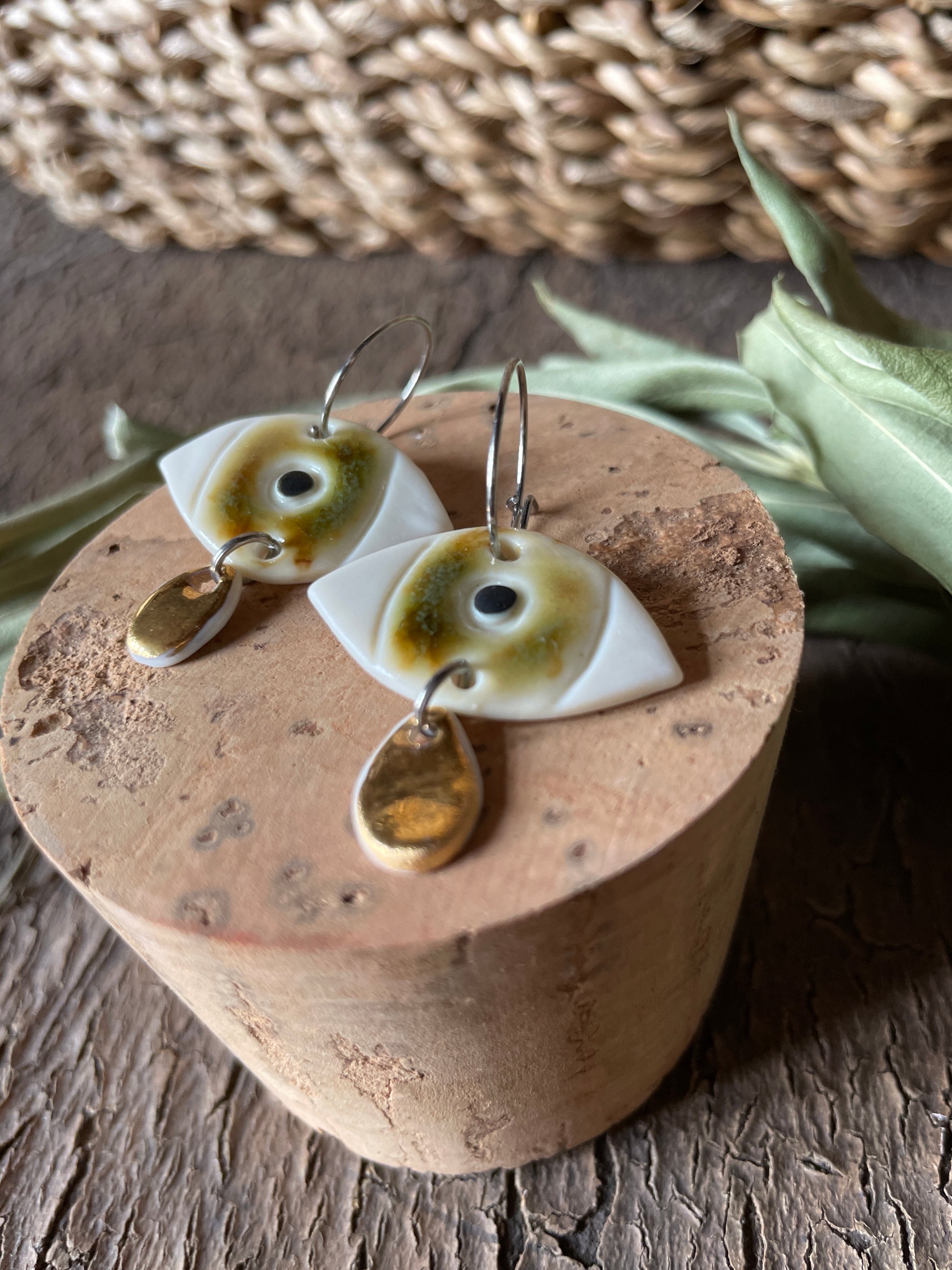 Questi pendenti occhio montati su cerchietto in acciaio anallergico, sono realizzati in fine Porcellana di Limoges decorata con smalti, cristallina e infine impreziositi con decoro oro 18K.
