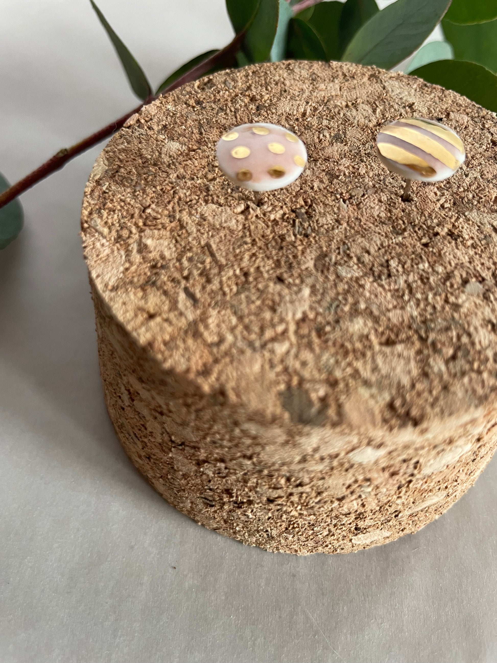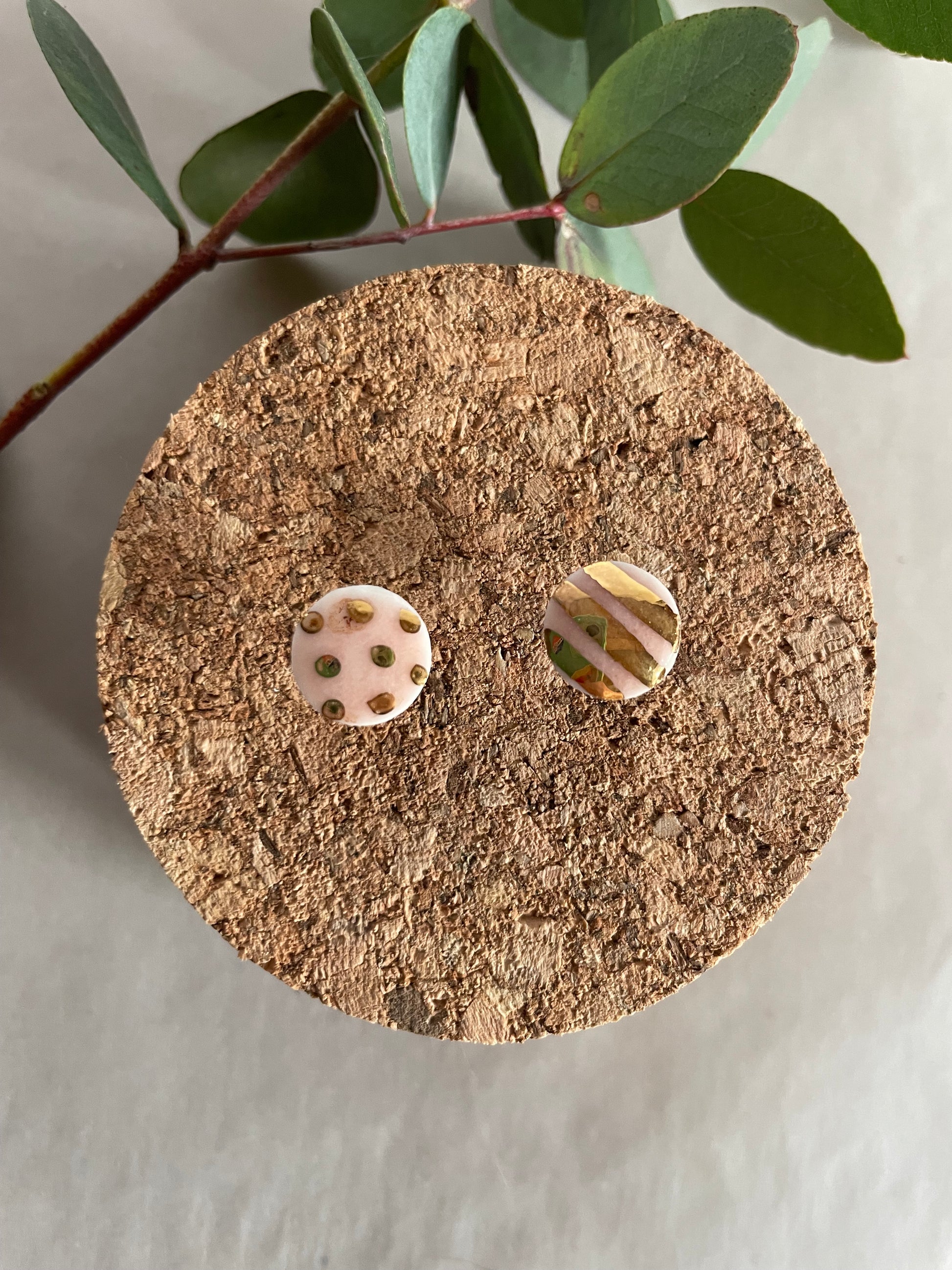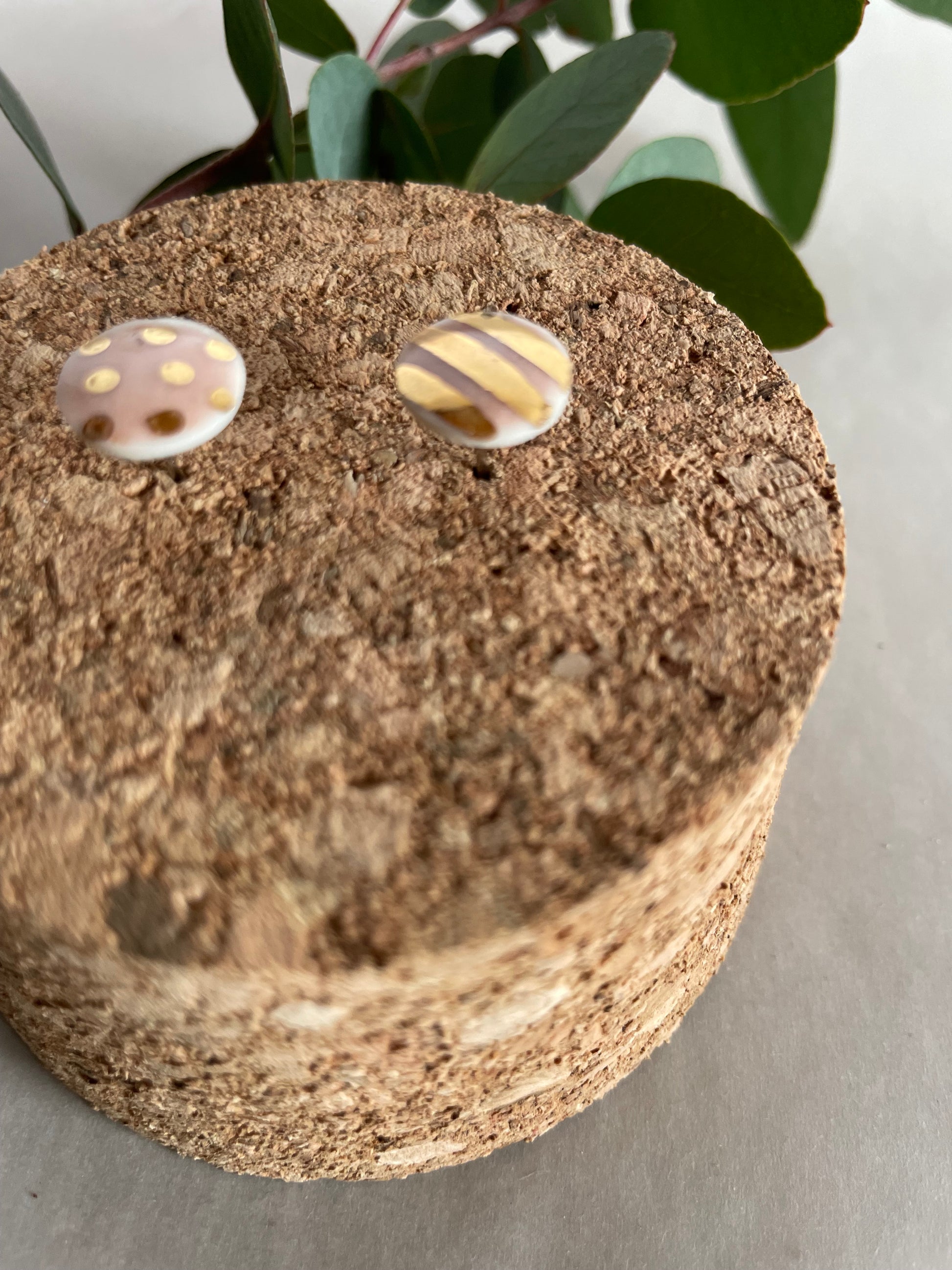 Orecchini porcellana, rosa e righe/pois oro(medi)