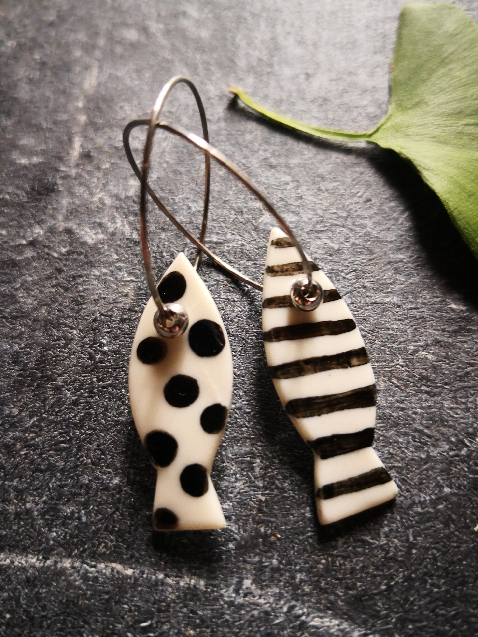Orecchini pesciolino pendenti in porcellana righe e pois