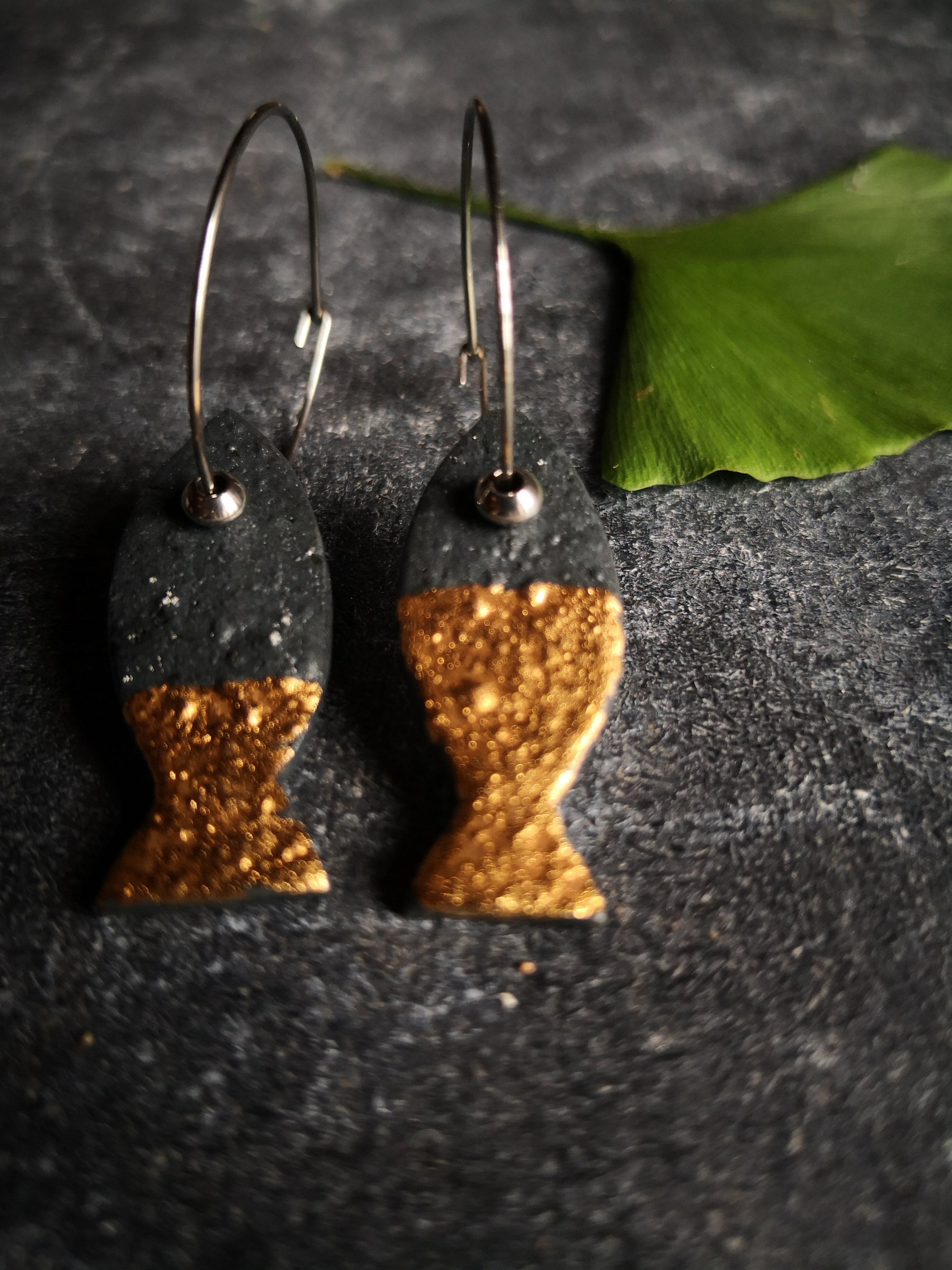 Questi pendenti pesciolino montati su cerchi in acciaio anallergico e impreziositi da piccole boule metalliche, sono realizzati in fine porcellana nera di Limoges, poi finiti con il lustro oro 18K.