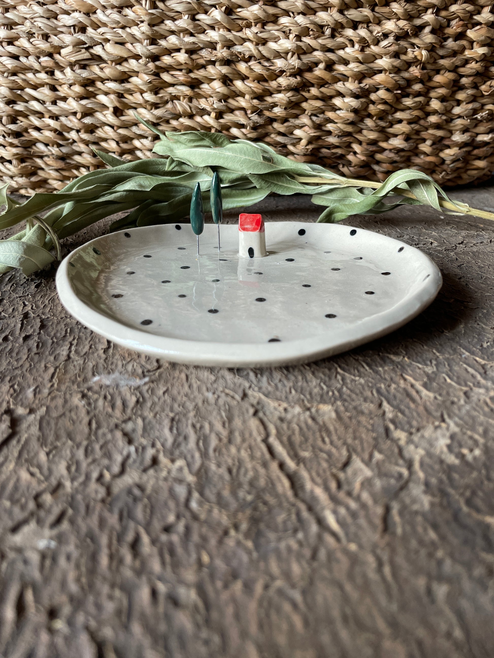 Piattino realizzato in grès crema, decorato in 3D con casetta e cipresso modellati a mano, colorati con colori a crudo, rifiniti con smalto trasparente che ne garantisce l'impermeabilità.