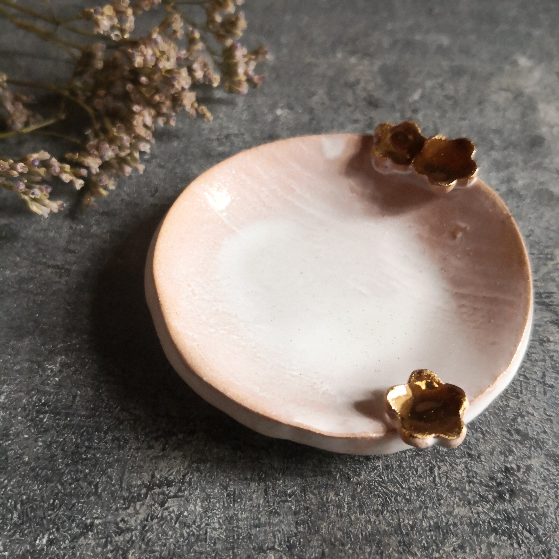 Piattino realizzato in terracotta rossa smaltato di bianco con fiorellini in lustro oro 18K, pensato per le piccole cose che proprio non possono essere perse. Ottima idea regalo per quell'amica che non sa mai dove riporre i suoi monili, o per chi ama presentare in modo speciali i dolcini agli ospiti.
