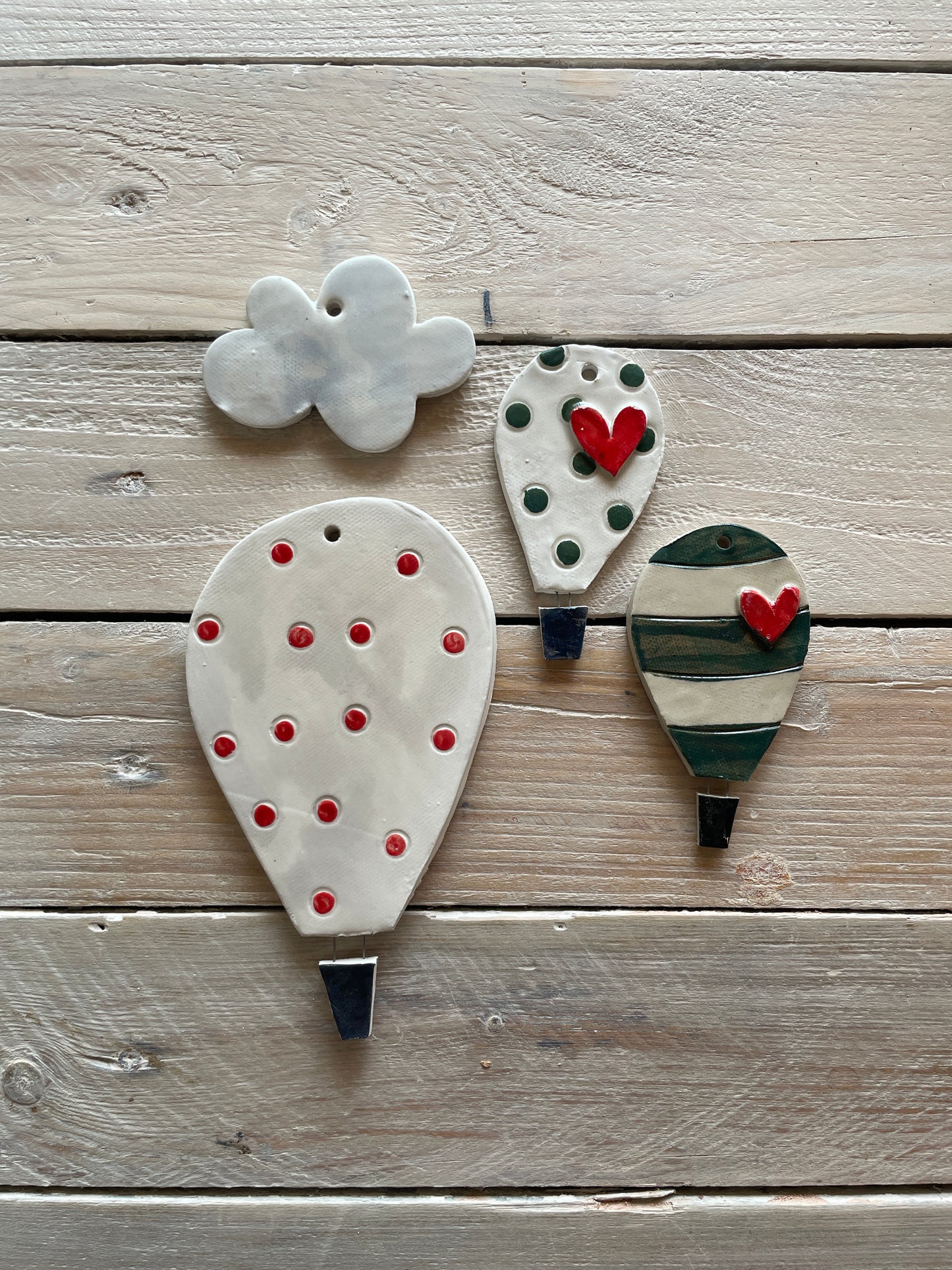 Set di mongolfiere da appendere decorative in terracotta bianca, engobbi e cristallina trasparente. Intagliato e decorato a mano.