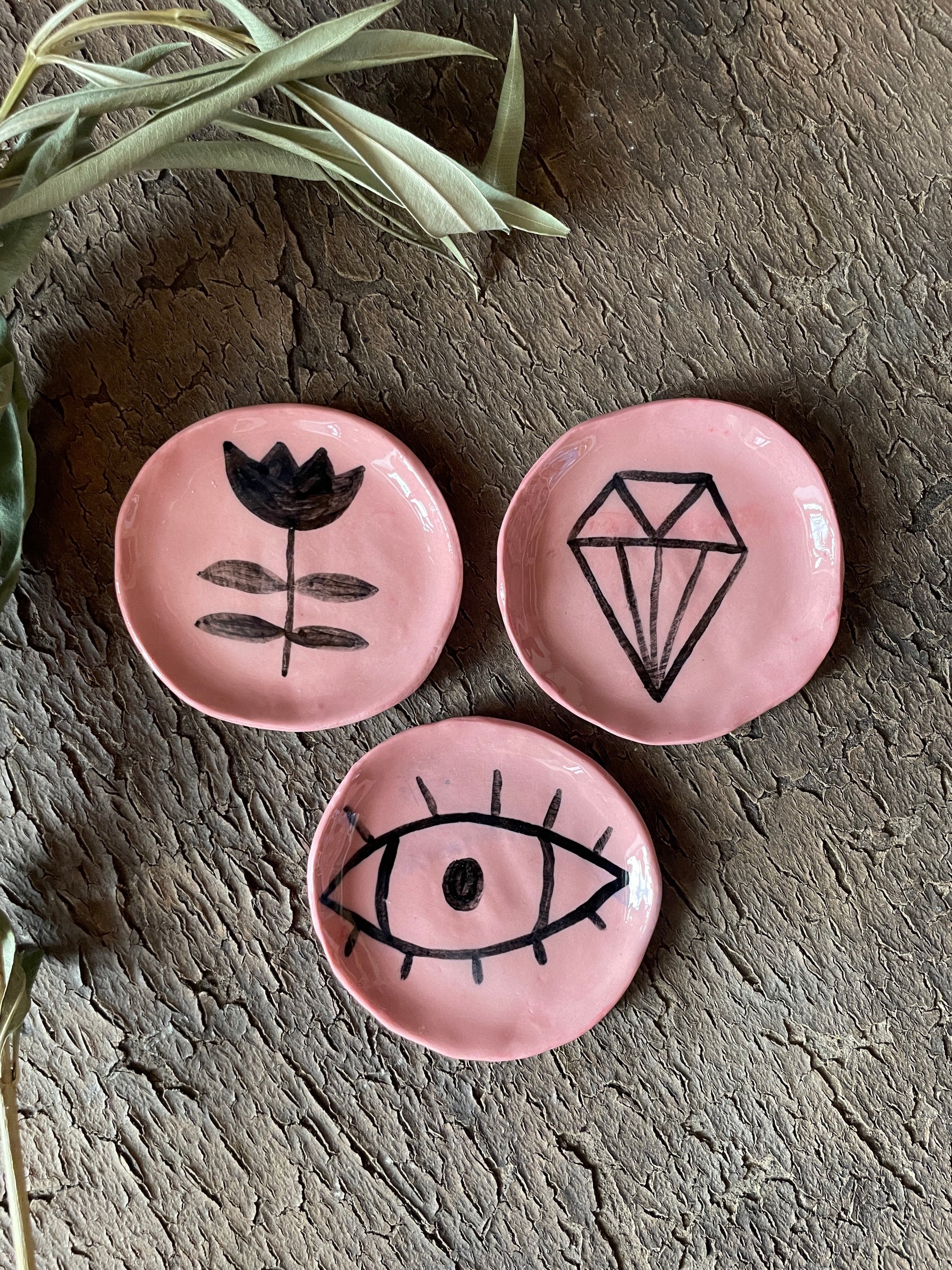 Piattini realizzati in porcellana rosa dipinta a mano e poi smaltata con cristallina trasparente atossica , pensato per le piccole cose che proprio non possono essere perse. Ottima idea regalo per quell'amica che non sa mai dove riporre i suoi monili, o per chi ama presentare in modo speciali i dolcini agli ospiti.