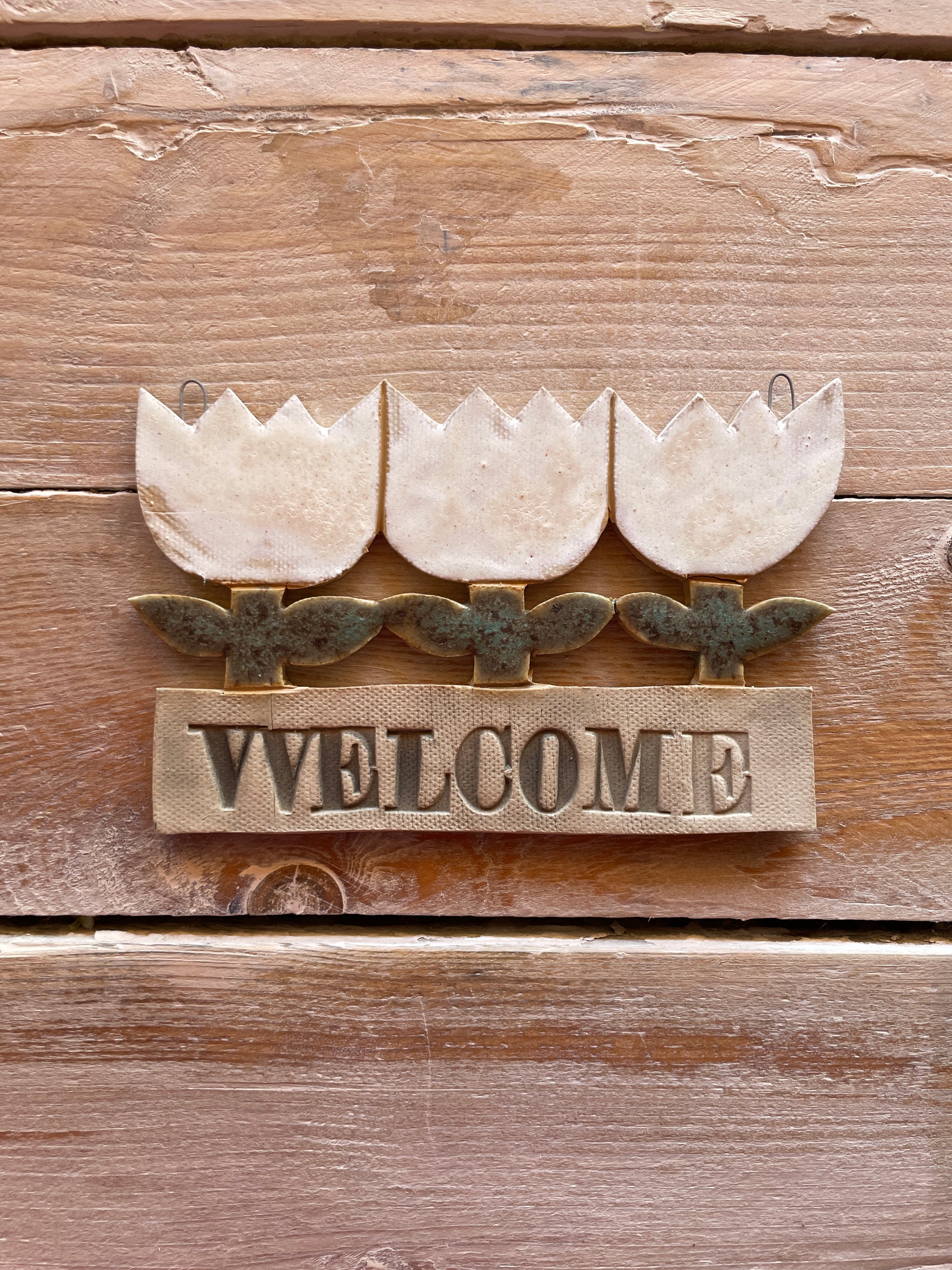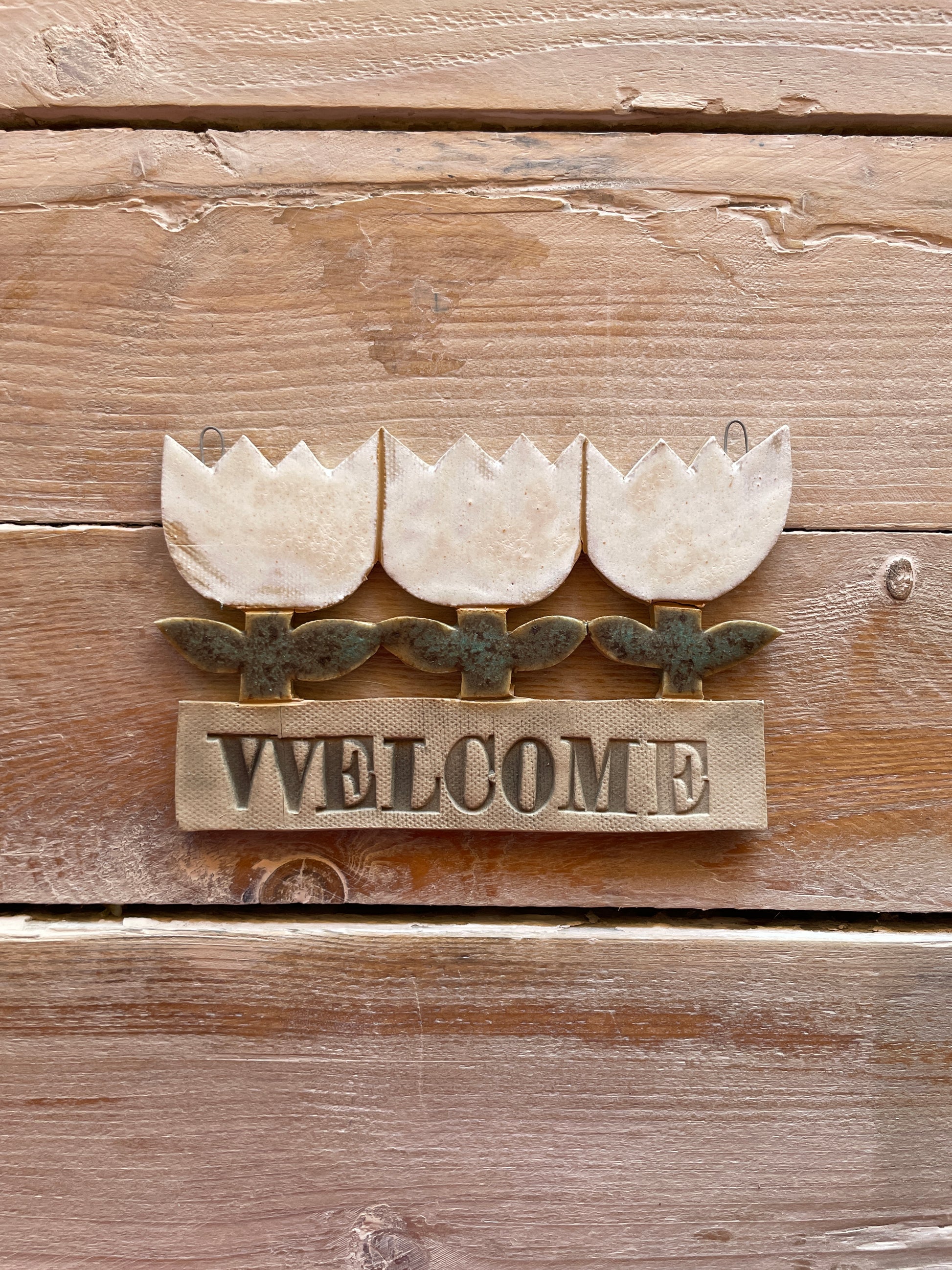 Accogli i tuoi ospiti con stile grazie alla targhetta Welcome in grès, decorata con tre tulipani in rilievo e una scritta realizzata con caratteri tipografici dal fascino vintage. Perfetta per essere appesa all’ingresso di casa, unisce eleganza e resistenza, rendendo ogni entrata più calda e accogliente.