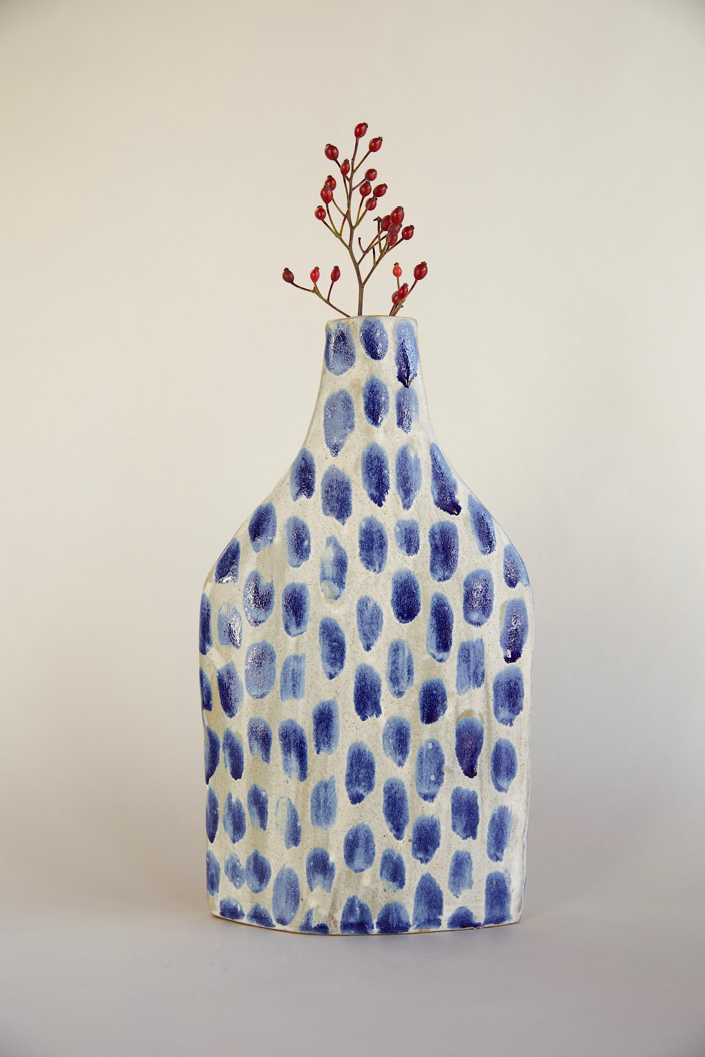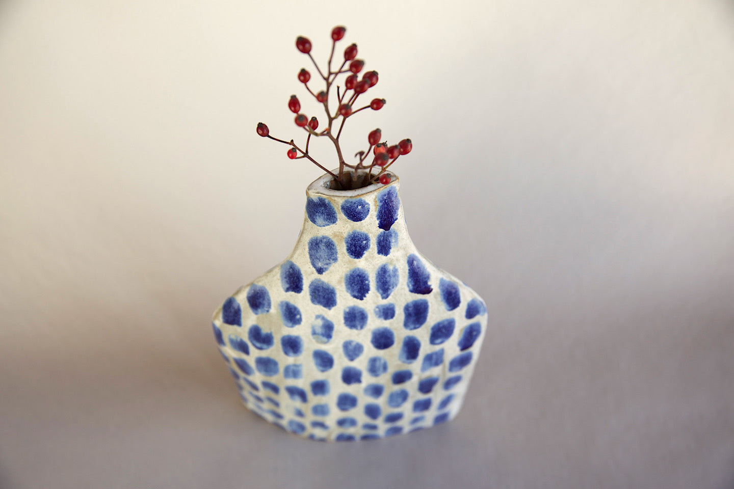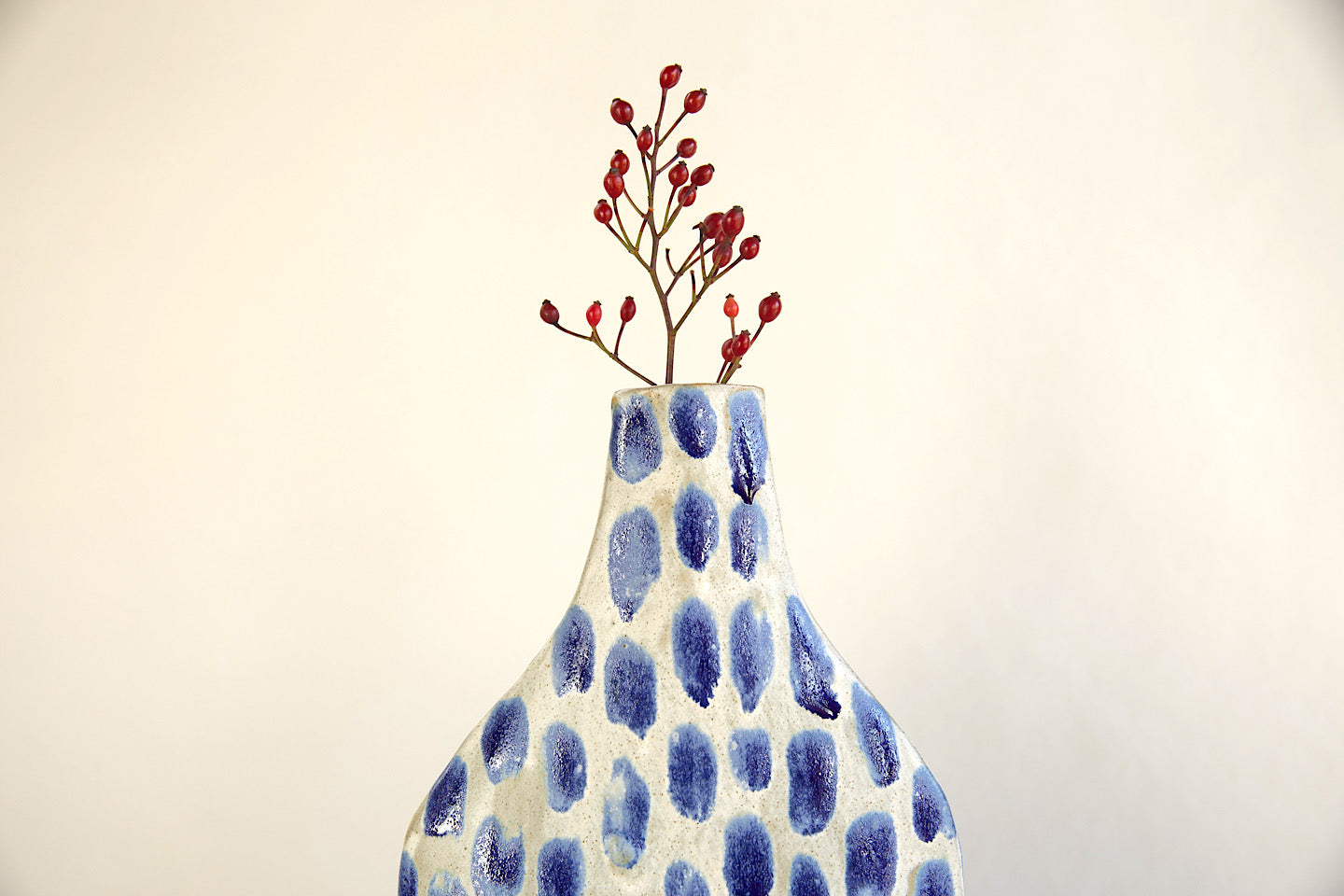 Smaltato di bianco opaco e decorato a mano con smalto blu.